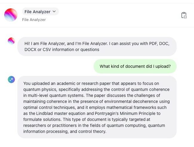 Upload documents, such as literature or your own papers, and let AI analyze its content. Afterwards talk to the document and let AI answer your questions while allowing you to ask follow-up questions.